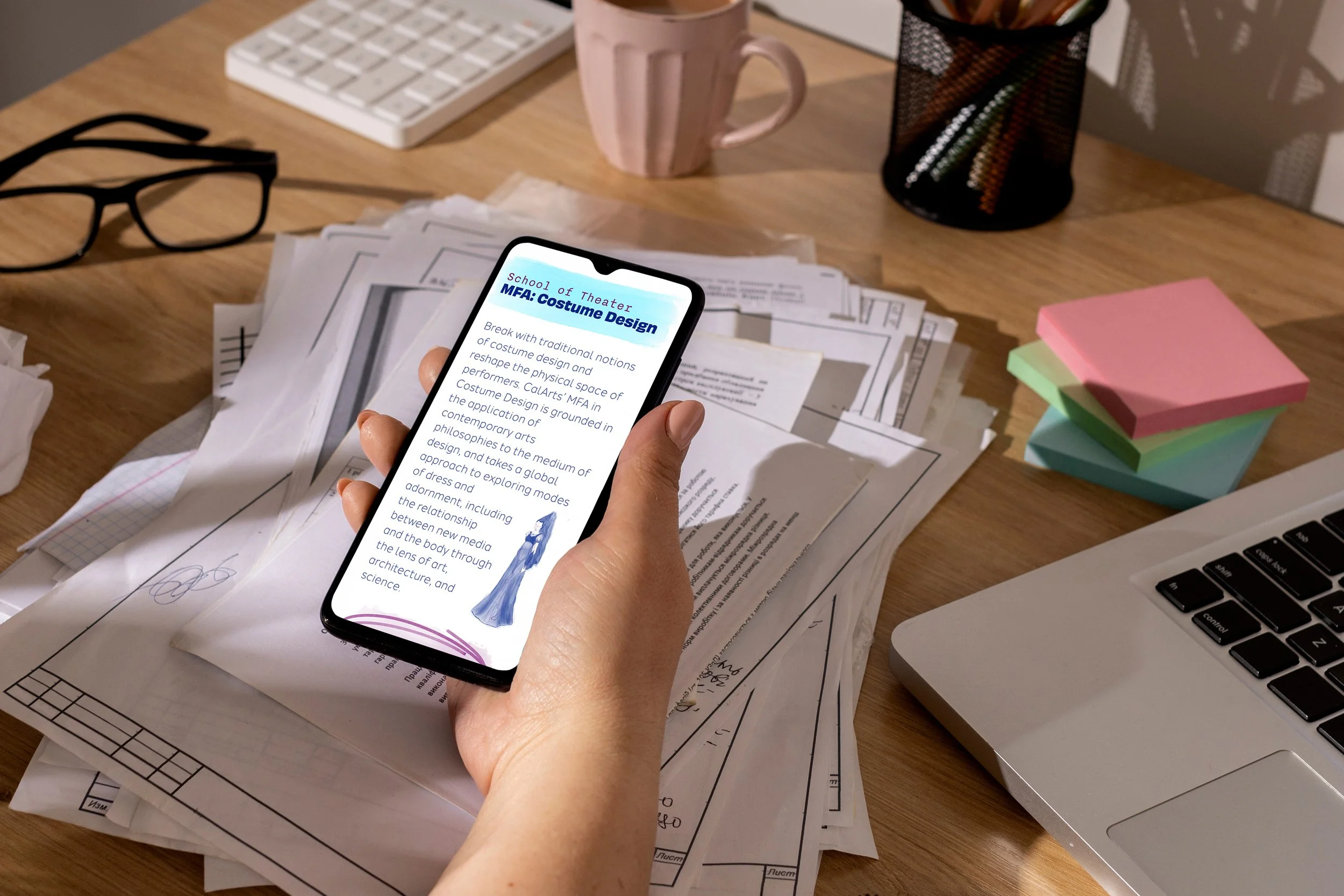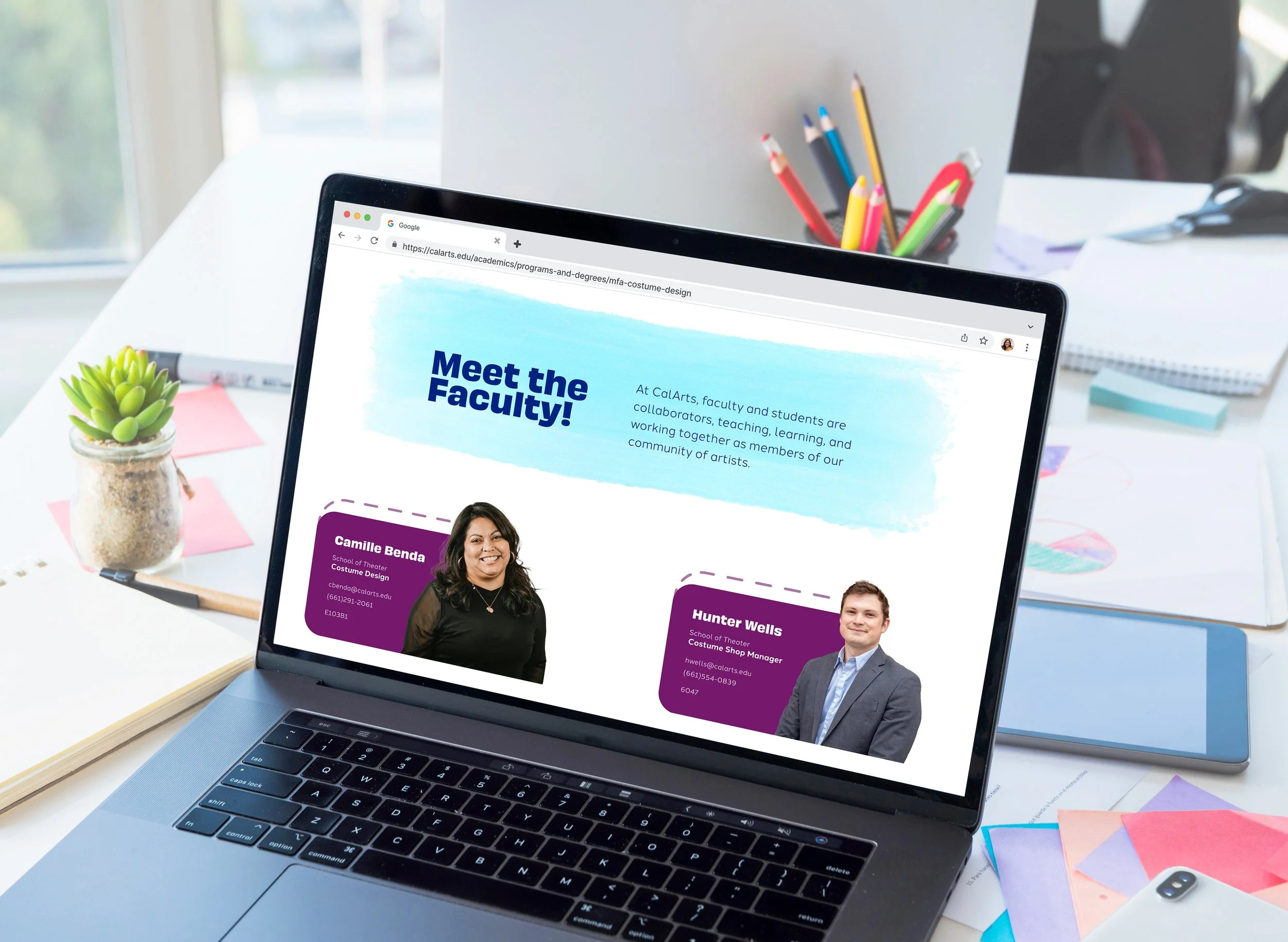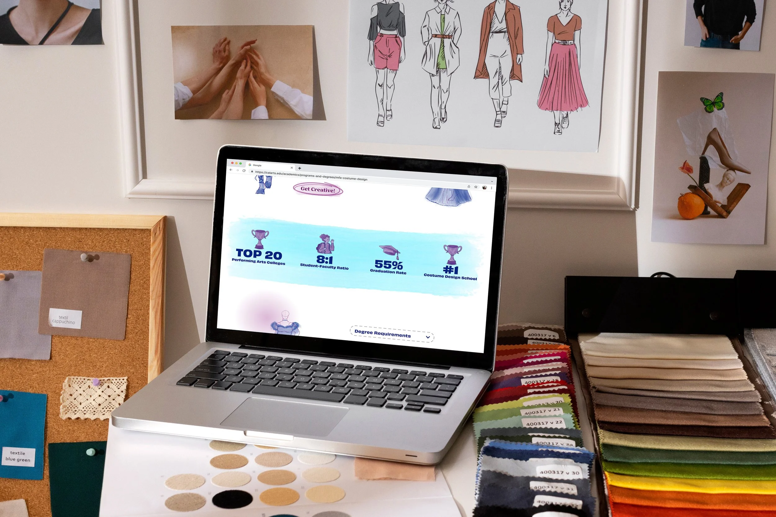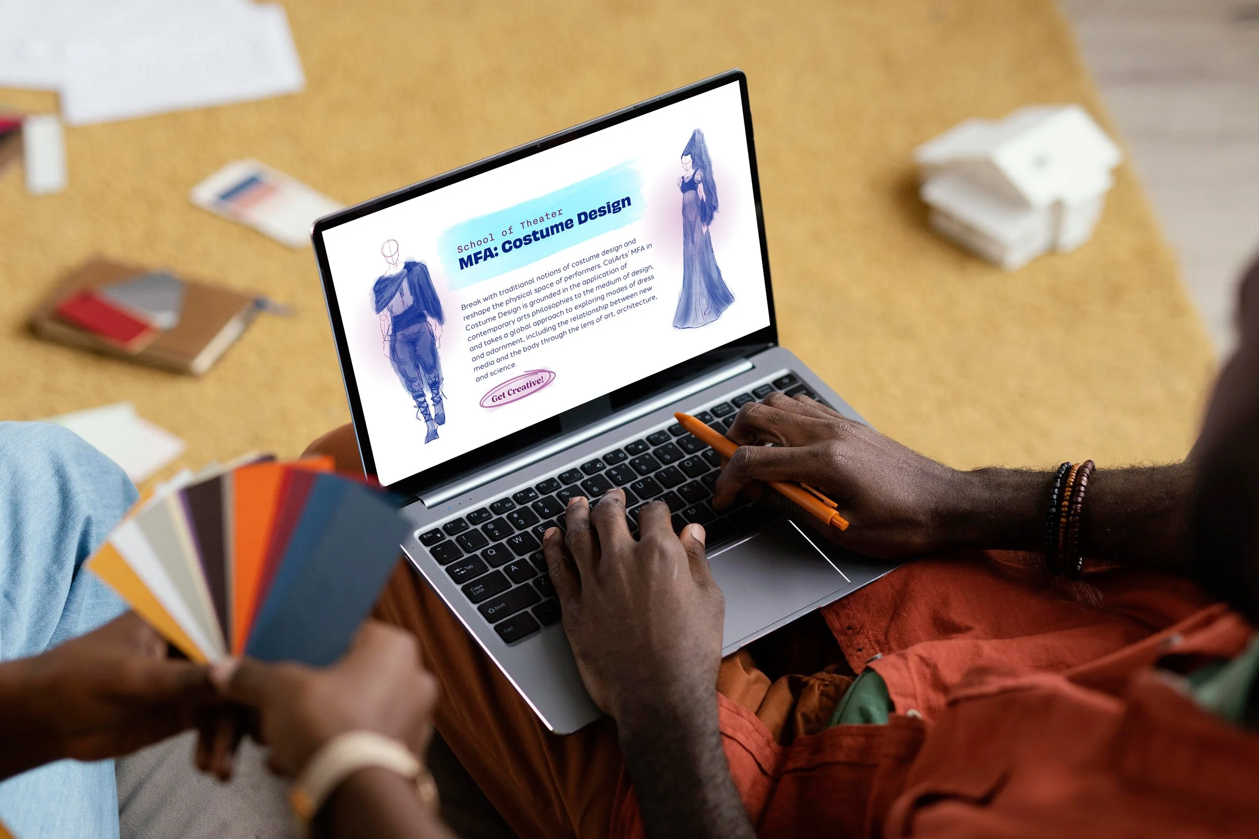 The CalArts MFA Costume Design program page lacked visual personality and did not fully reflect the creativity of the discipline, making it less engaging for prospective students. The target audience included applicants interested in hands-on, expressive design programs. The process focused on refining content while drawing inspiration from the costume design workflow, including sketching and mixed media exploration. The final design introduced custom illustrations and textured elements, creating a page that better communicates the program’s creative identity and aligns visually with the practices of the costume design program.